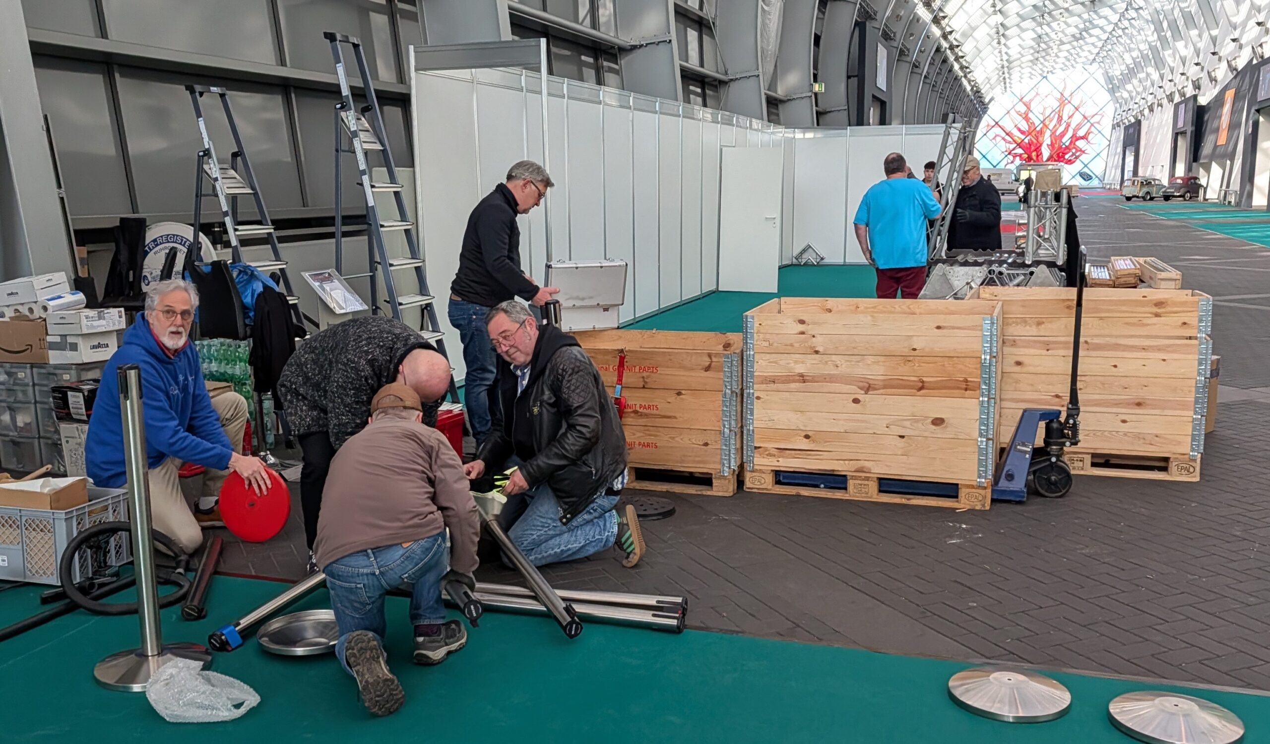 Nach dem letzten Messetag am Sonntag trafen sich am frühen Abend wieder fleißige „Messe-Abbauer“ der Essener und Kölner Gruppe, um dem Stand abzubauen und im LKW zu verstauen. Am Montagmorgen machten sich dann Michael K. und Michael S. auf den Weg nach Oldenburg, wo der Messestand wieder bei der Bremer Gruppe eingelagert wurde.