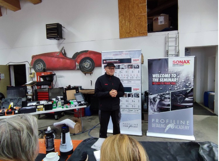 hören alle sehr gespannt zu. Von der kleinen Lappenkunde, über das Benutzen von einem Lackdickenmessgerät oder einem Lacktemperatur-messgerät, bis zum richtigen Einsatz von Poliermaschinen und den jeweiligen Mitteln, lernen wir die Basis der professionellen Autopflege.